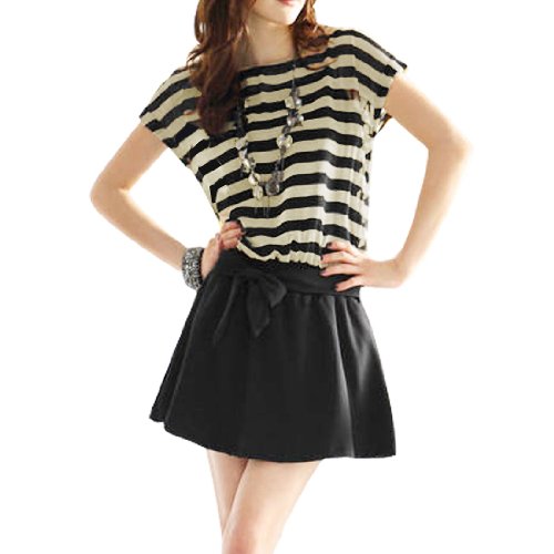 Allegra K Lady Beige Black Stripes Pullover Elastic Waist Summer