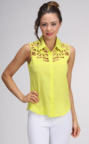 Yellow Abstract Cage Cut Out Button Down Tank Sleeveless Sexy