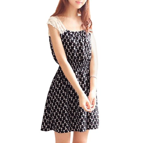 Allegra K Ladies Lace Patchwork Square Neckline Cartoon Cats Pattern Summer Dress