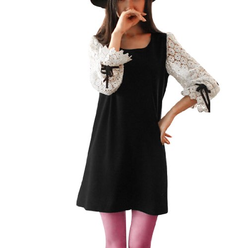 Ekberg Women Round Neck Pullover 3/4 Sleeve Patchwork Bow Decor Casual Dress Black Xs