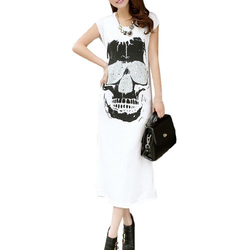 Allegra K Ladies Scoop Neck Rhinestone Decor Skull Front Dress White XS